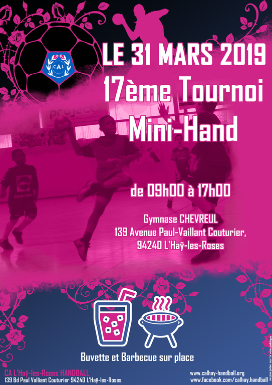 Le 17ème tournoi de Mini-Hand de l'Hay les Roses aura lieu Dimanche 31 mars à partir de 09h00 et jusqu'à 17h00 (environ).