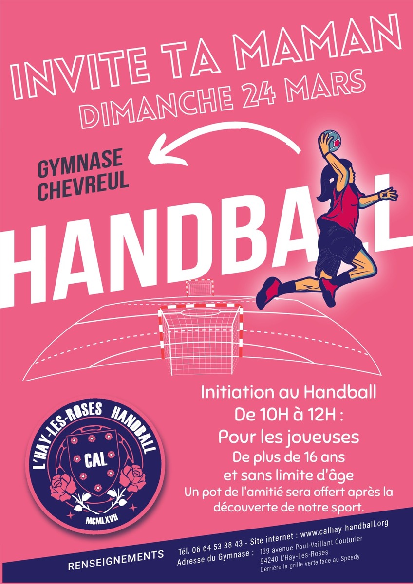 A l'occasion de la Journée Internationale des droits des Femmes, le 8 Mars, la municipalité de L'Haÿ-Les-Roses a souhaité célébrer cette journée tout au long du mois de Mars avec un programme riche. Le CAL HANDBALL a voulu participer à cette manifestation, en proposant un moment de découverte du HANDBALL dédiée aux femmes avec l'événement "INVITE TA MAMAN" qui aura lieu le Dimanche 24 Mars de 10H à 12H au Gymnase CHEVREUL Cet événement s'inscrit aussi dans l'ensemble des événements liés aux JO PARIS 2024.