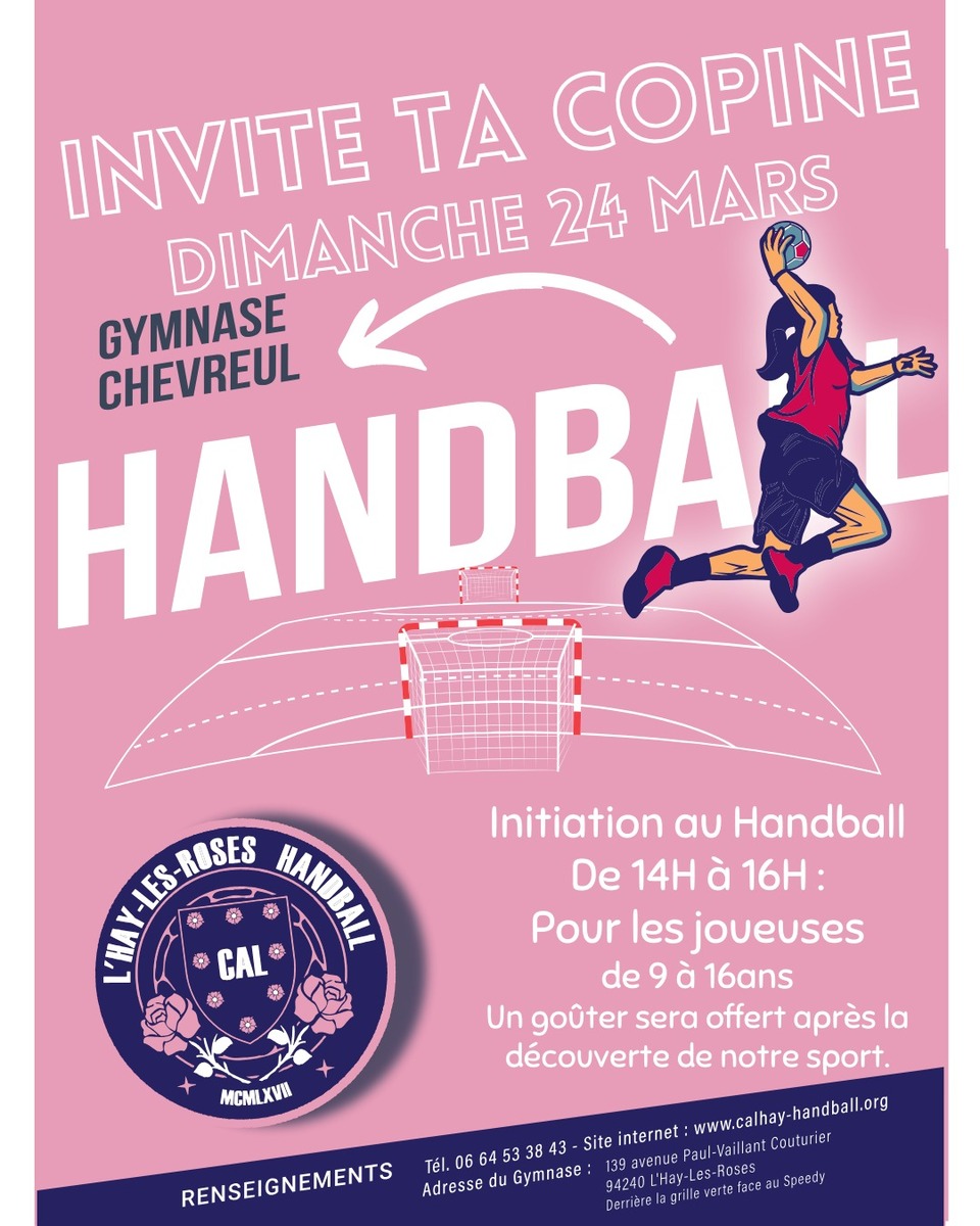 A l'occasion de la Journée Internationale des droits des Femmes, le 8 Mars, la municipalité de L'Haÿ-Les-Roses a souhaité célébrer cette journée tout au long du mois de Mars avec un programme riche et varié. Le CAL HANDBALL a voulu participer à cette manifestation dans l'esprit des JO PARIS 2024, en proposant un moment de découverte du HANDBALL dédiée aux jeunes filles avec l'événement "INVITE TA COPINE" qui aura lieu le Dimanche 24 Mars de 14H à 16H au Gymnase CHEVREUL
